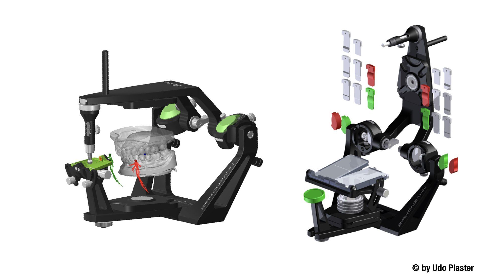 Physischer und virtueller Artikulator PS1 mit speziellen Geometrien, entwickelt zur Simulation patientenindividueller Dreh-, Gleit- und Schließbewegungen des Kiefers.